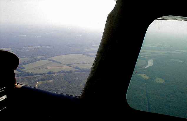 Following the river was tricky also because there was the typical Virginia-summer haze today, making the slant-range visibility less than optimum. If we went high, we couldn't see it, and if we stayed low, we couldn't see where it was going in time to turn. About 1000 feet above the ground turned out to be best. You can get a sense of our view in this photo, although we could see somewhat better than my camera could. It was actually a moderately bright day.