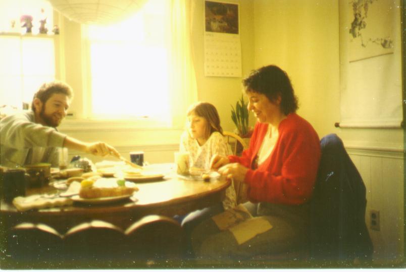 This 35 mm slide is a "difficult" one to scan because I took it with available light only, and there was a strong north light coming in the windows behind the subjects. I scanned the top image at 600 dpi, using my earlier method of placing white paper on top of the slide to reflect the scanner's internal light back through the slide. (You can see some of my experiments in scan resolution using this method.)