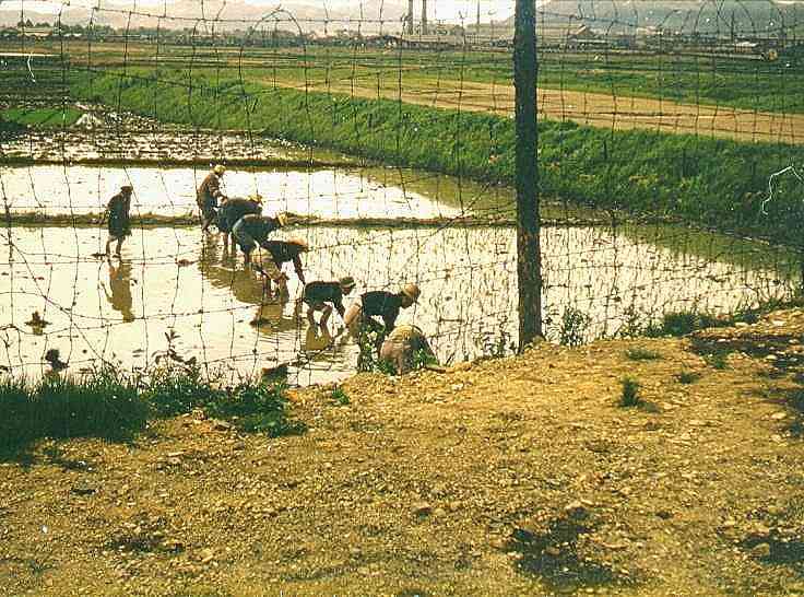 farmers planting rice just outside the fence of a U.S. Army airfield, A-33,